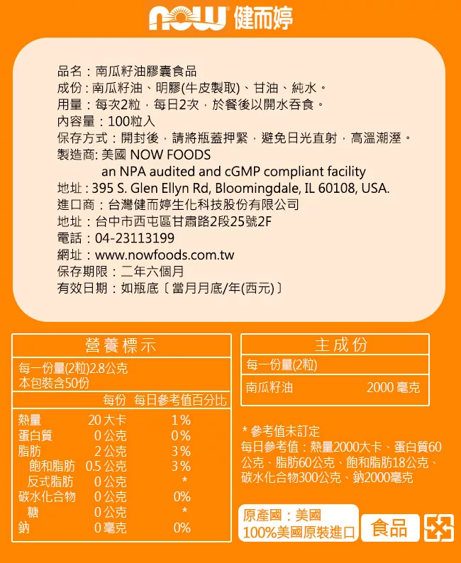 NOW健而婷-南瓜籽油(100顆-瓶) 評價