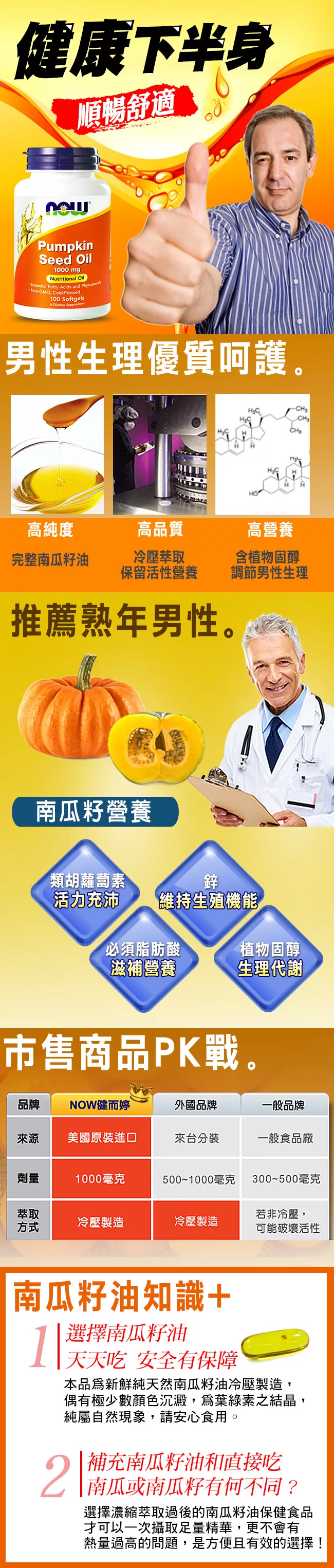 為多種不飽和脂肪酸的絕佳來源,美國NOW所生產的南瓜籽油 以最先進的冷壓製造方法,保留營養活性成份,一顆含有1000毫克的南瓜籽油,可以調節男性生理機能!